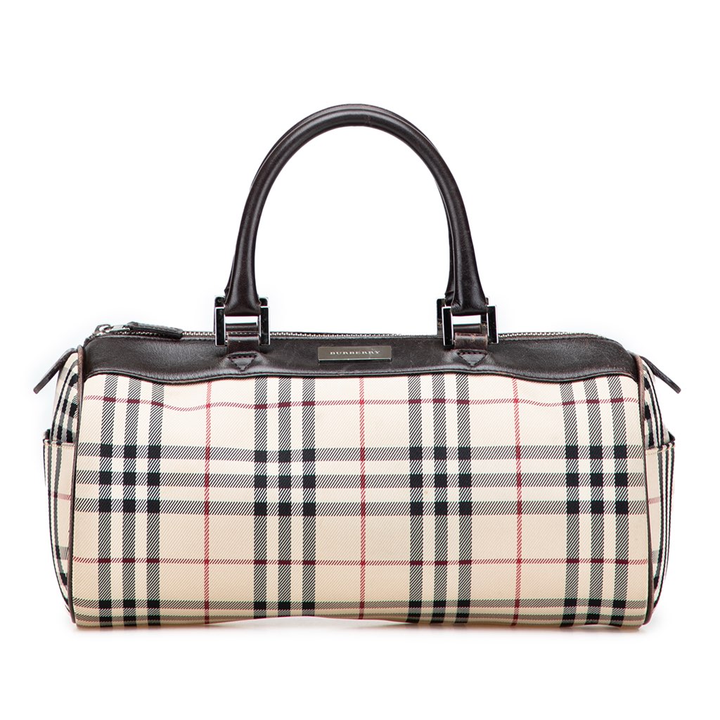 This handbag features a house check canvas body with leather trim, rolled leather handles, a top zip closure, and exterior side slip pockets.