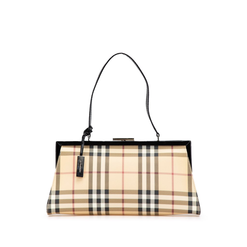 This handbag features a canvas body, flat leather handles, a top clasp closure, and an interior zip pocket.