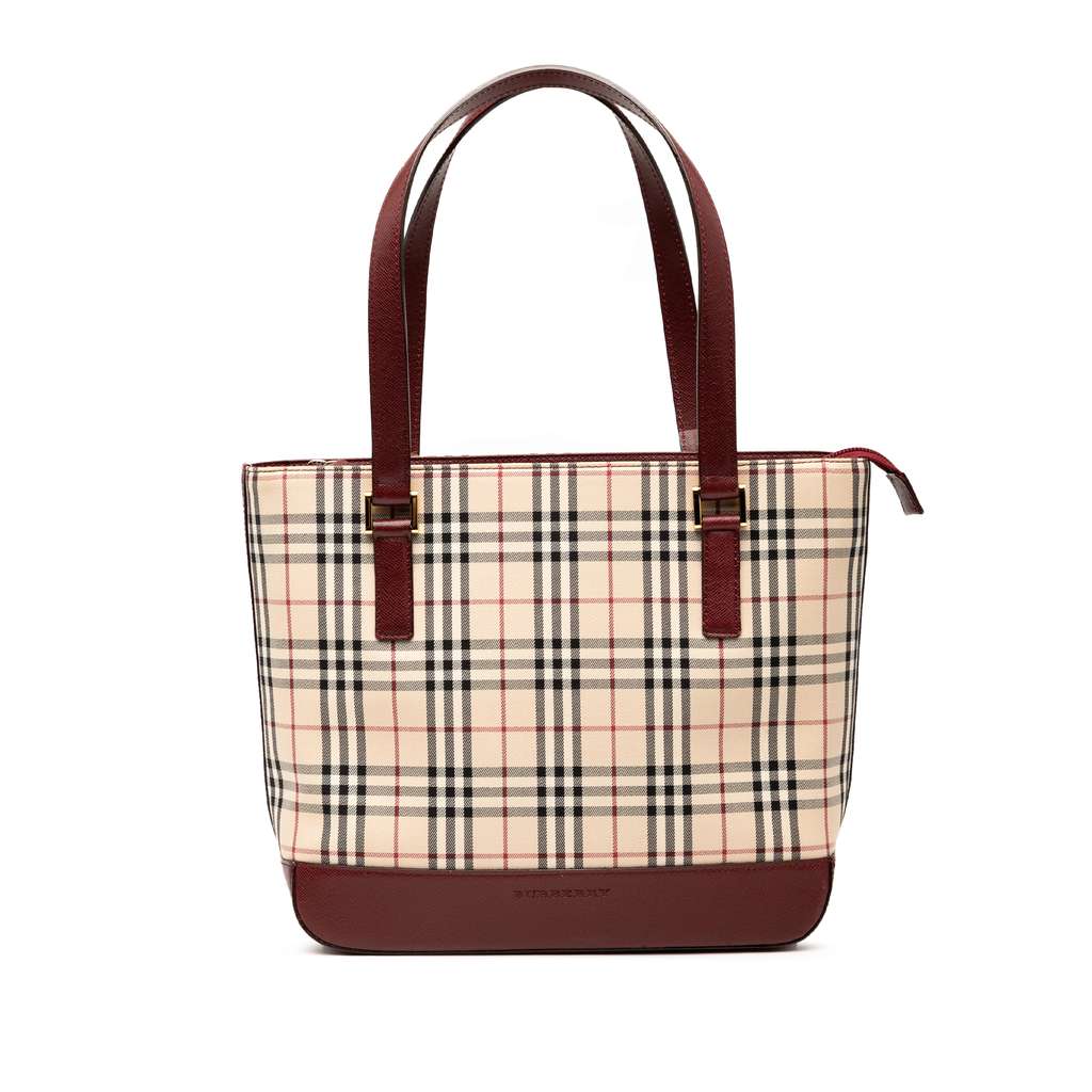 This handbag features a house check canvas body with leather trim, flat leather handles, a top zip closure, and interior zip and slip pockets.