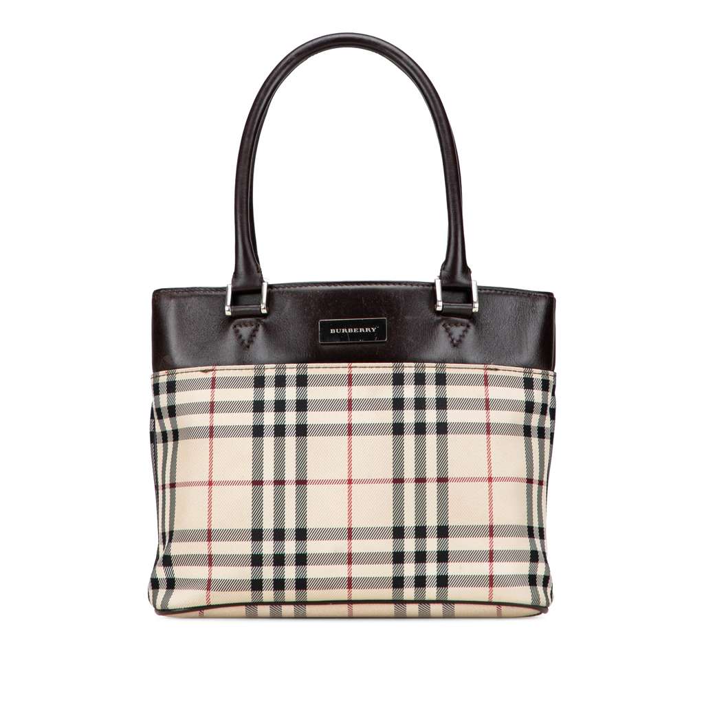 This handbag features a house check canvas body with leather trim, rolled leather handles, an open top, and an interior zip compartment.