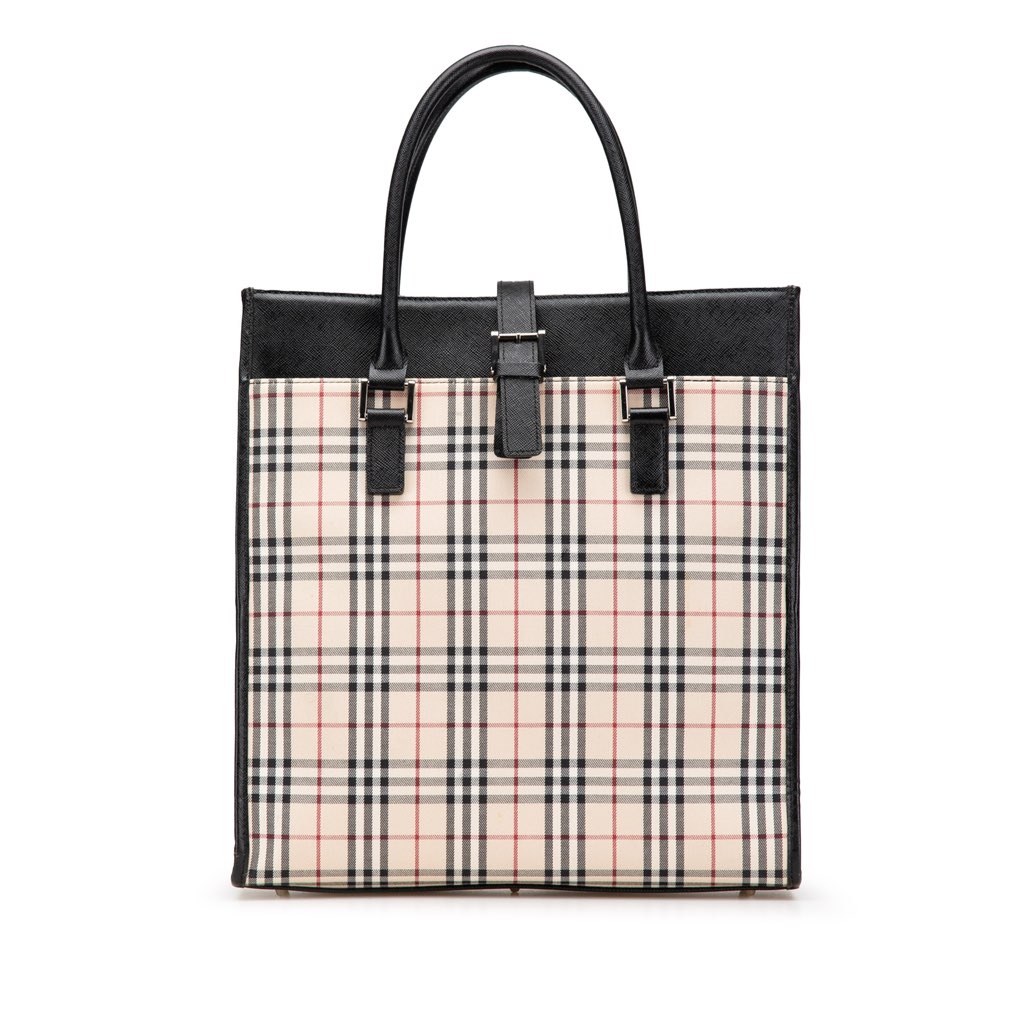 This tote bag features a plaid canvas body with leather trim, rolled leather handles, an open top with top strap with buckle closure, and interior zip and slip pockets.