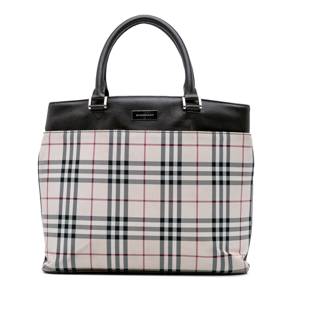 This tote bag features a house check canvas body with leather trim, rolled leather handles, an open top, an interior zip compartment, and interior zip and slip pockets.
