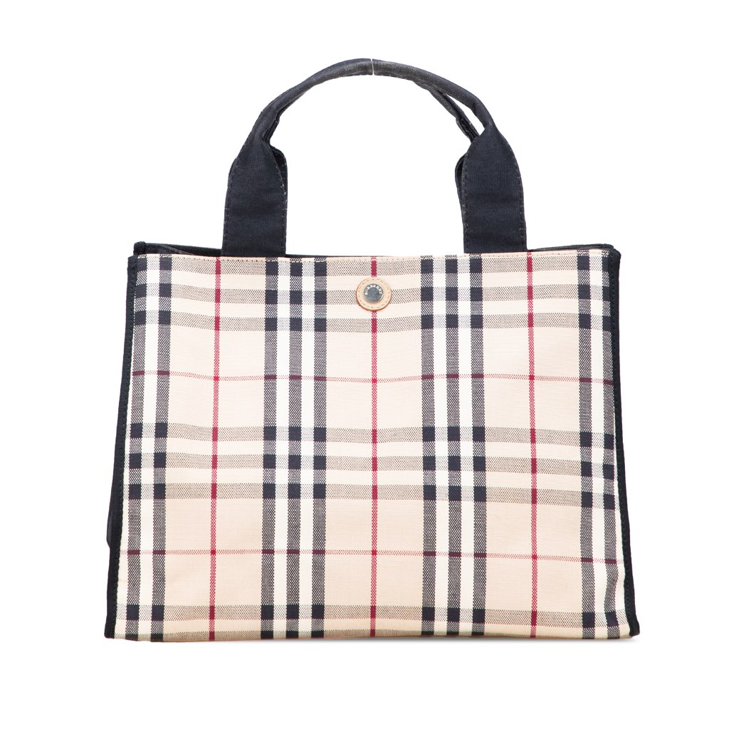 This tote bag features a house check canvas body, flat straps, an open top with magnetic snap closure, and interior zip and slip pockets.