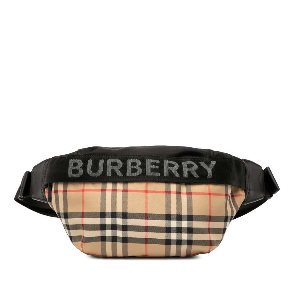 This belt bag features a house check nylon body, an adjustable canvas waist strap, a front zip closure, an exterior back zip pocket, and an interior slip pocket.