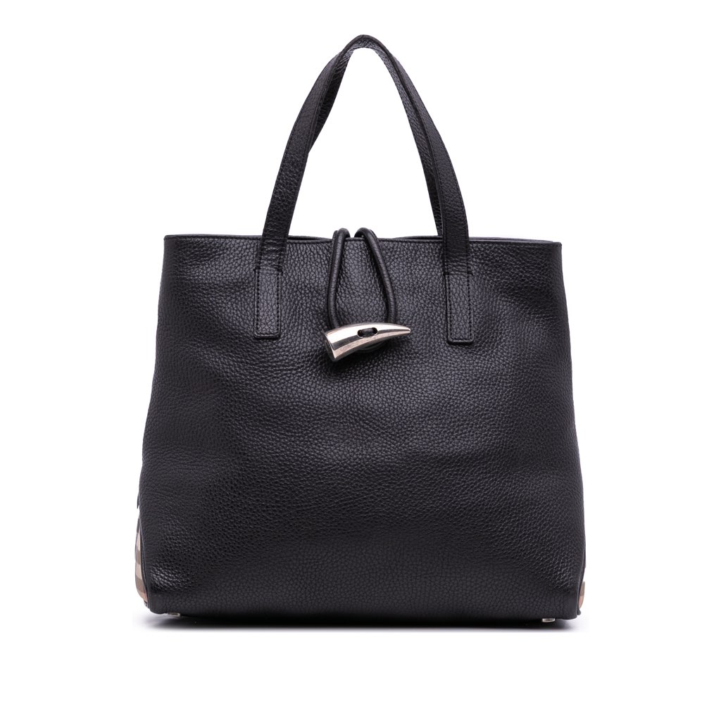 This tote bag features a leather body, flat leather top handles, an open top with horn toggle closure, and interior zip and slip pockets.