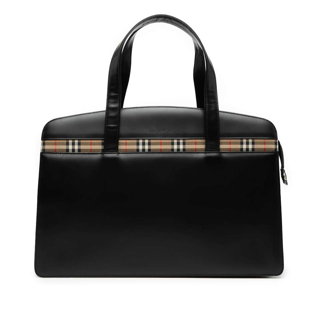 This handbag features a leather body with house check canvas trim, flat leather handles, a top zip closure, an exterior slip pocket, and interior zip and slip pockets.