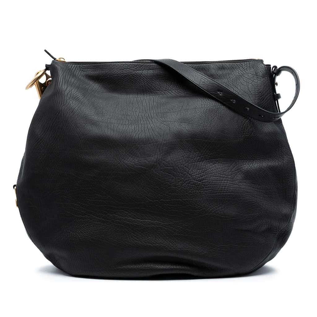 This shoulder bag features a leather body, a flat leather shoulder strap, a top zip closure, and an interior slip pocket.