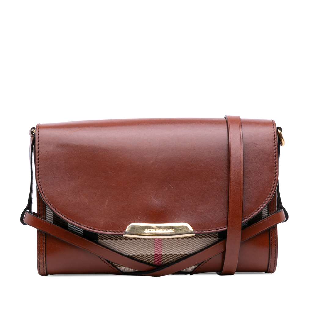 This crossbody bag features a house check canvas body with leather trim, an adjustable flat leather strap, a top leather flap with magnetic snap closure, and an interior zip pocket.