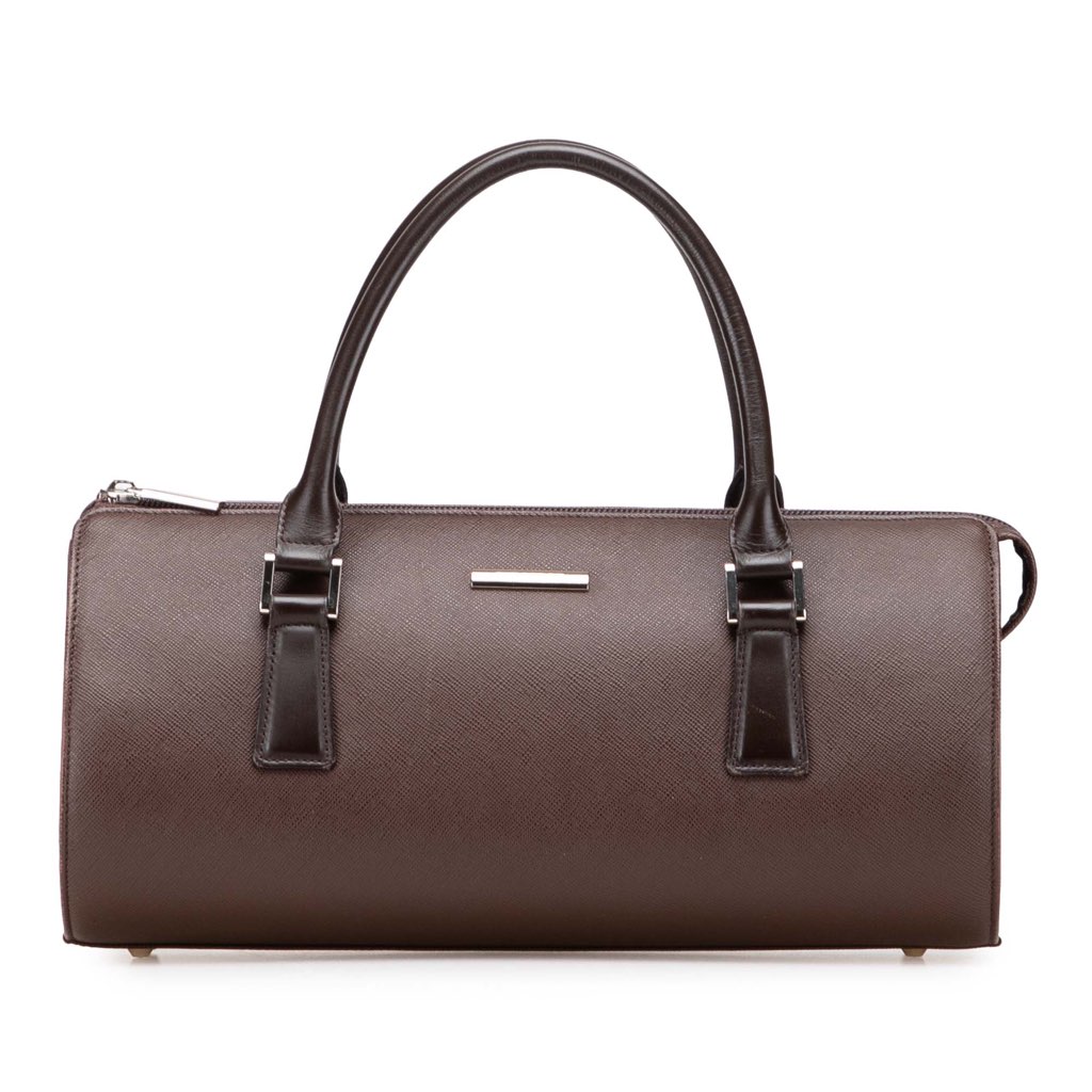 This boston bag features a leather body, rolled leather handles, a top zip closure, and an interior zip pocket.