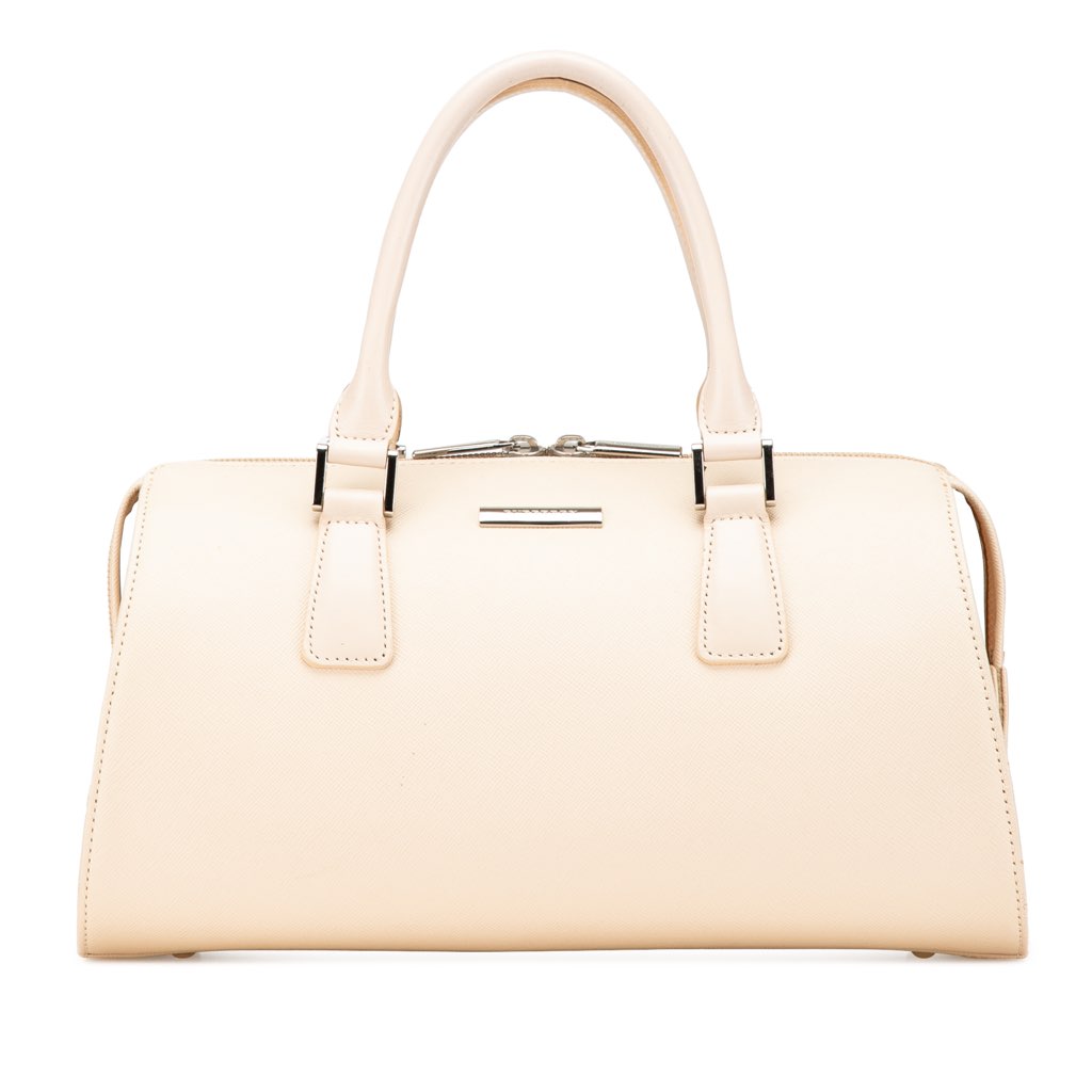 This handbag features a leather body, rolled leather handles, a top zip closure, and interior zip and slip pockets.