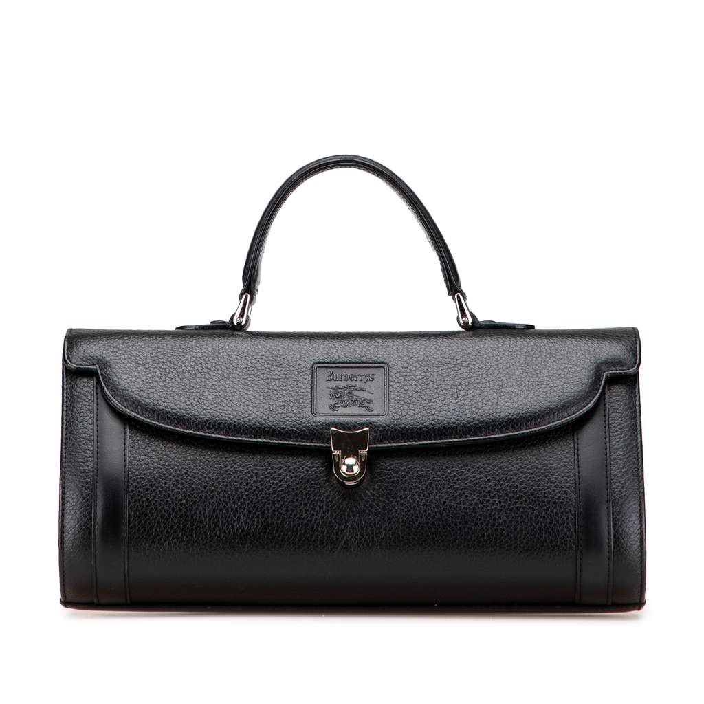 This handbag features a leather body, a flat top handle, a front flap with a stud closure, and interior zip and slip pockets.