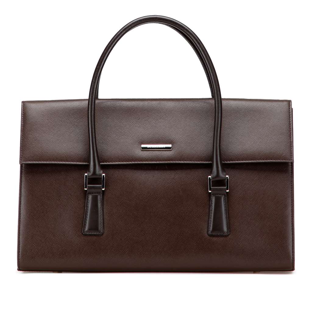 This handbag features a leather body, rolled leather handles, a front flap with magnetic snap closure, and interior zip and slip pockets.