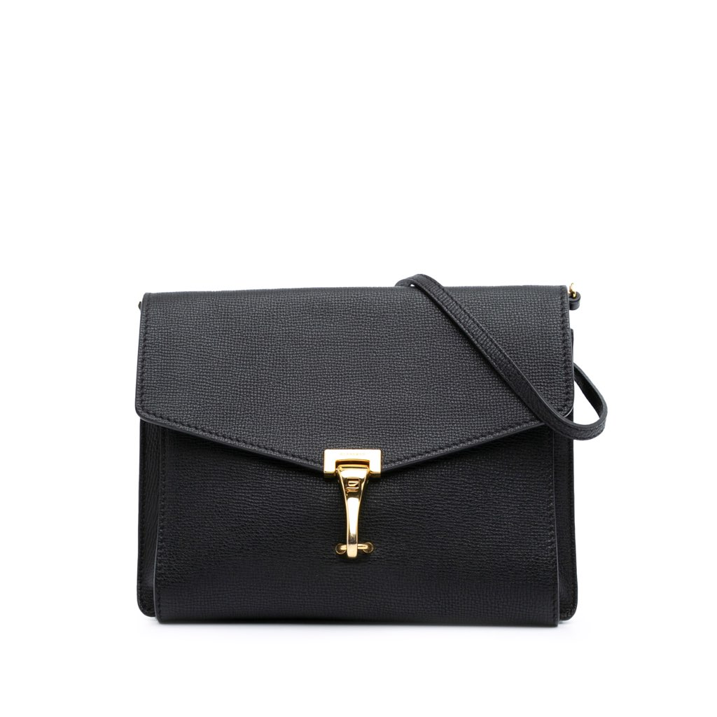 The Macken features a leather body, an adjustable flat leather strap, a flap with a clasp closure, an exterior back zip pocket, and an interior slip pocket.