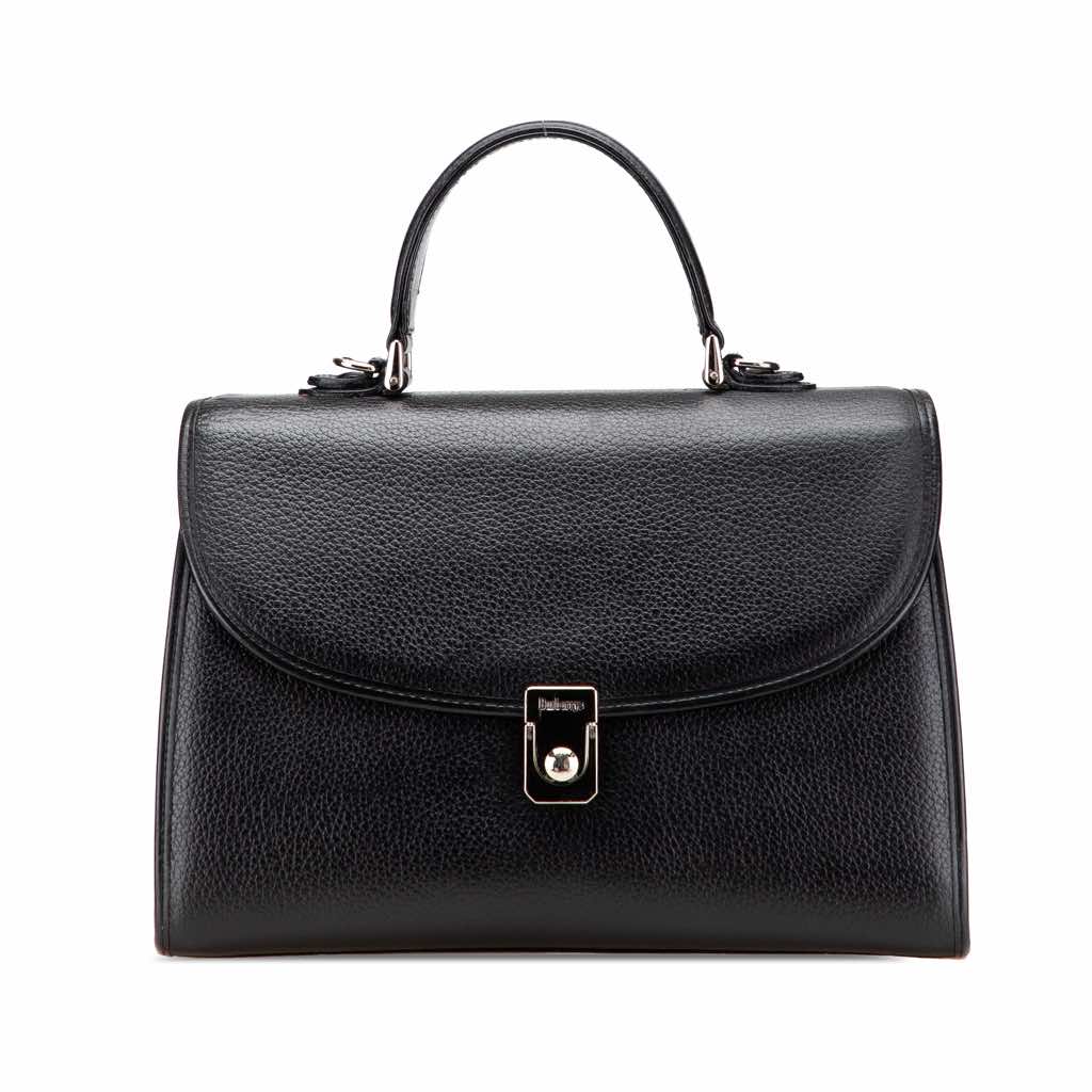 This satchel features a leather body, a flat leather top handle, a front flap with a metal push lock closure, and interior zip and slip pockets.