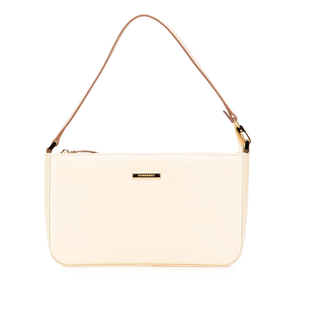 This shoulder bag features a leather body, a flat leather strap, a top zip closure, and an interior zip pocket.