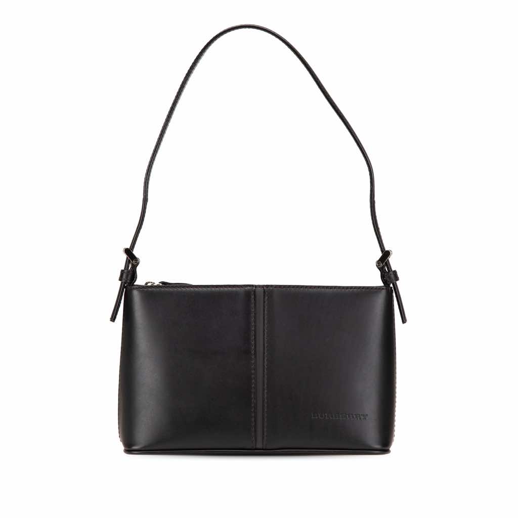 This shoulder bag features a leather body, a flat leather strap, a top zip closure, and interior zip and slip pockets.