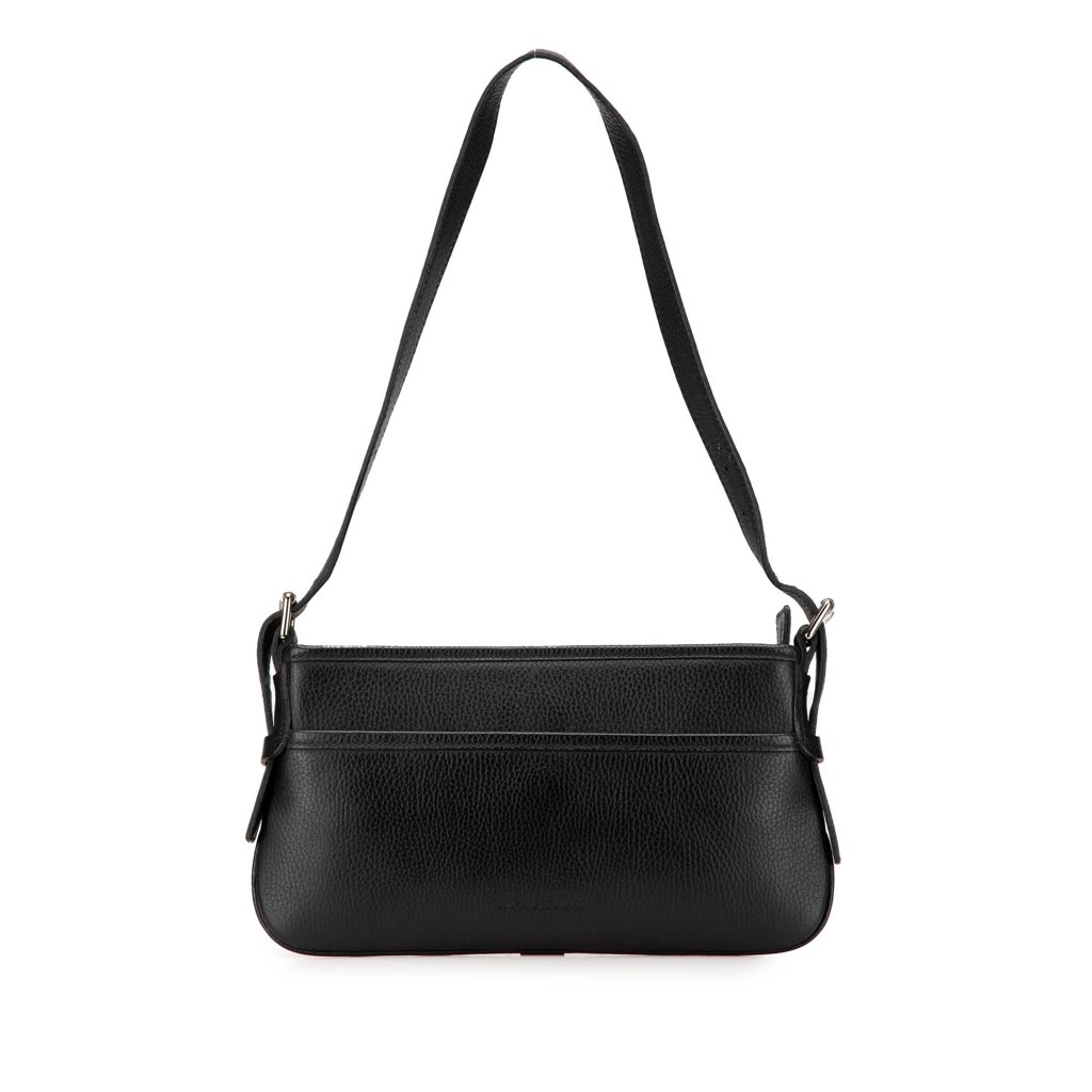 This shoulder bag features a leather body, a flat leather strap, a top zip closure, exterior front and back pockets with magnetic closure, and interior zip and slip pockets.