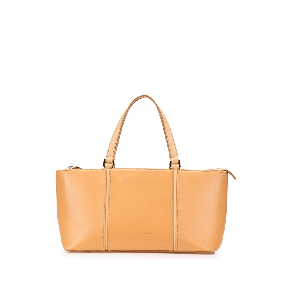 This tote features a leather body, flat leather handles, a top zip closure, and interior zip and slip pockets.