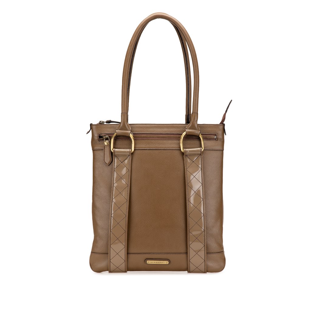 This tote bag features a leather body with patent leather trim, rolled leather handles, a top zip closure, an exterior front zip pocket, and interior zip and slip pockets.