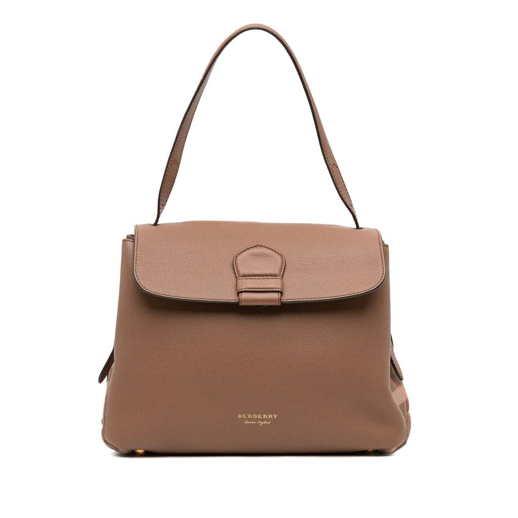 The Camberley satchel features a leather body with canvas trim, a flat leather handle, a front flap with snap button closure, and interior slip and zip pockets.