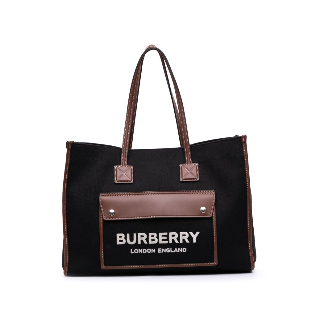 This tote features a canvas body leather trim, flat leather handles, an open top with a snap button closure, an exterior front flap pocket with snap button closures, and interior zip and slip pockets.
