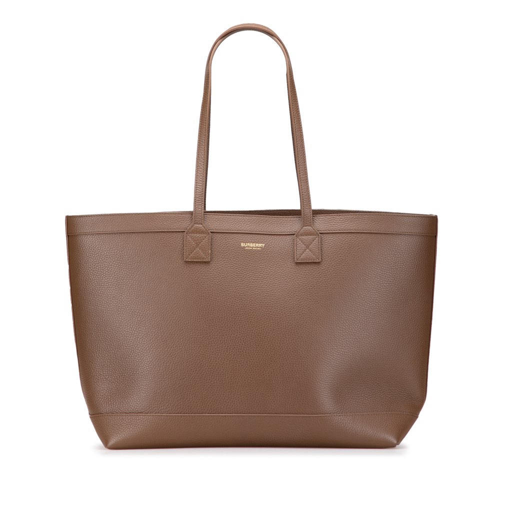 This tote features a leather body, flat leather straps, an open top, and an interior pocket.