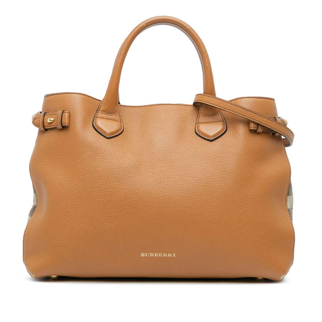 The Banner features a leather body with canvas trim, rolled leather handles, an adjustable and detachable flat leather strap, an open top with magnetic snap closure, an interior zip compartment, and interior zip and slip pockets.
