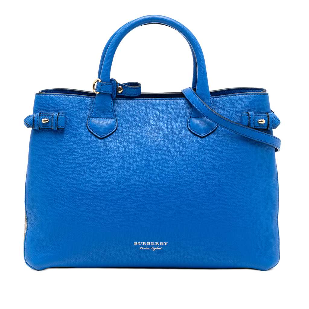 The Banner features a leather body with house check canvas side panels, rolled leather handles, an adjustable and detachable flat leather strap, an open top with magnetic snap closure, an interior zip compartment, and interior zip and slip pockets.