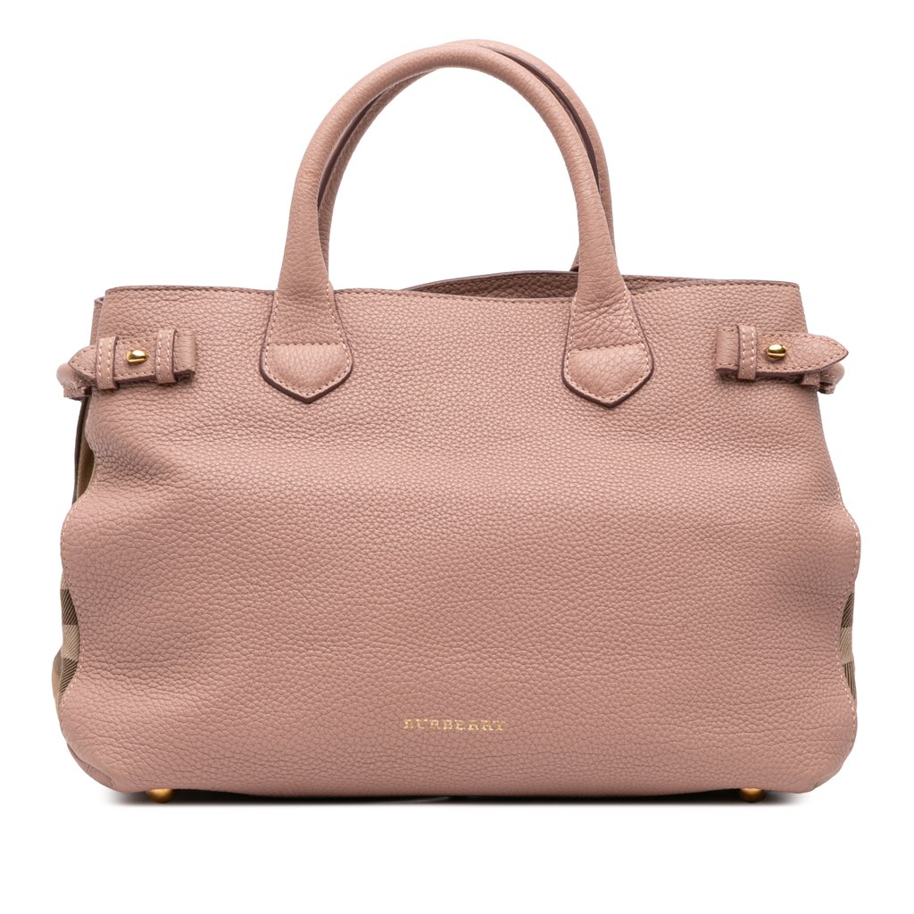 The Banner satchel features a leather body with canvas trim, rolled leather handles, an open top with magnetic snap closure, an interior zip compartment, and interior zip and slip pockets.