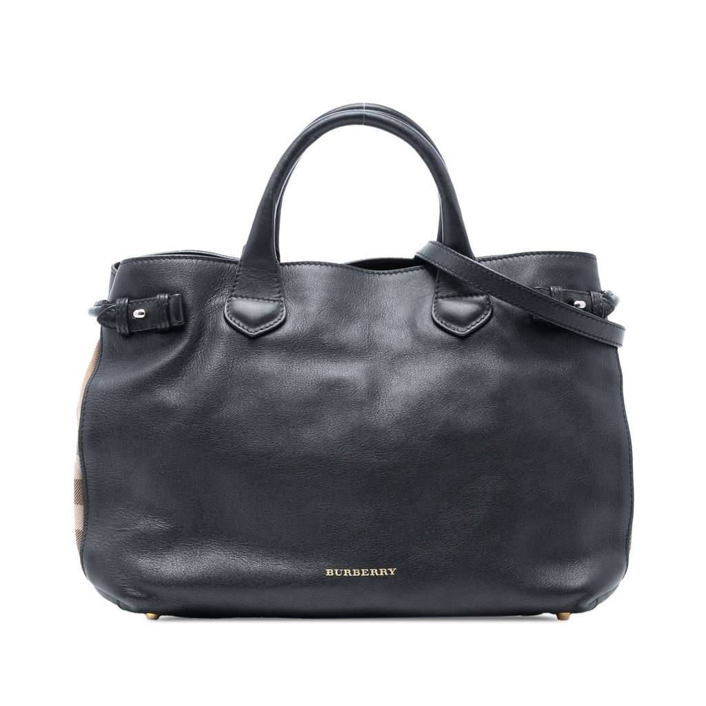 The Banner satchel features a leather body with house check canvas trim, rolled leather handles, an adjustable and detachable flat leather strap, an open top with magnetic snap closure, an interior zip compartment, and interior zip and slip pockets.