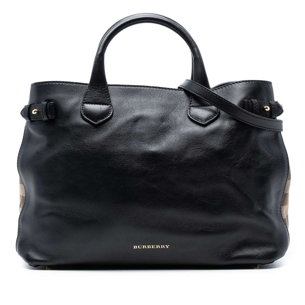The Banner satchel features a leather body with house check canvas side panels, rolled leather handles, an adjustable and detachable flat leather strap, an open top with magnetic snap closure, an interior zip compartment, and interior zip and slip pockets.