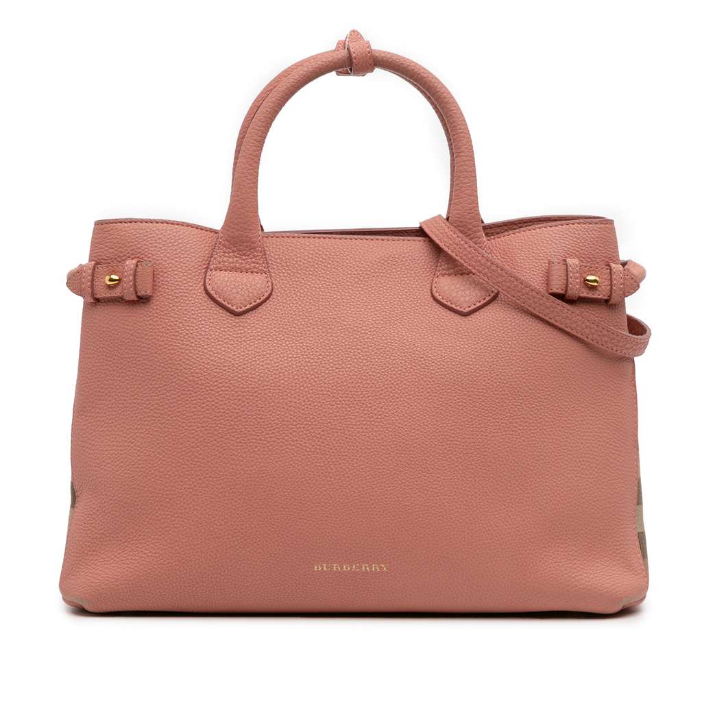 The Banner features a leather body with house check canvas trim, rolled leather handles, an adjustable and detachable flat leather strap, an open top with magnetic snap closure, an interior zip compartment, and interior zip and slip pockets.