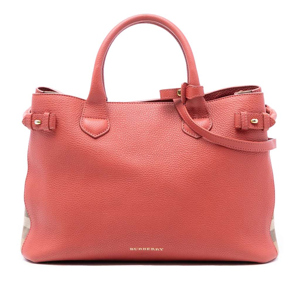 The Banner satchel features a leather body with house check canvas trim, rolled leather handles, an adjustable and detachable flat leather strap, an open top with magnetic snap closure, an interior zip compartment, and interior zip and slip pockets.