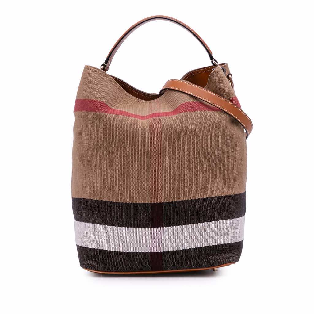This bucket bag features a mega check canvas body, a flat leather handle, an adjustable flat leather strap, an open top with a snap closure, and a pouch inclusion.