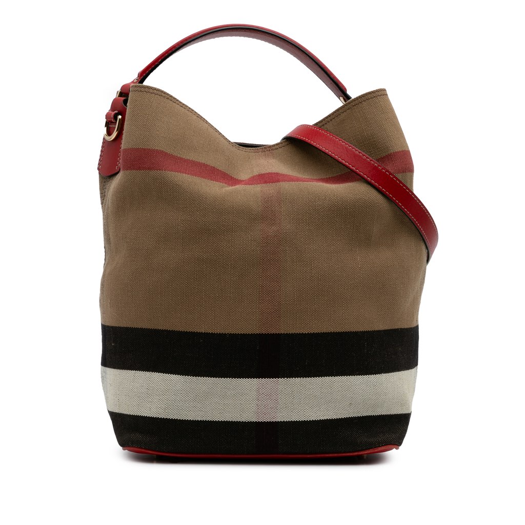 This bucket bag features a canvas body with leather trim, a flat leather handle, an adjustable leather strap, an open top with clasp closure, interior zip and slip pockets, and a pouch inclusion.