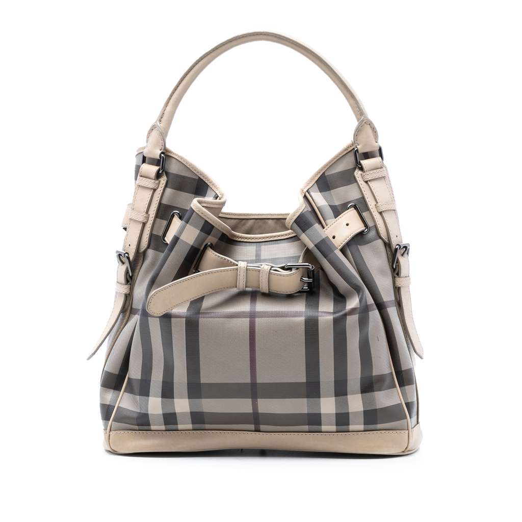 This shoulder bag features a coated canvas body with leather trim, a rolled leather strap, an open top, an interior zip compartment, and an interior zip pocket.