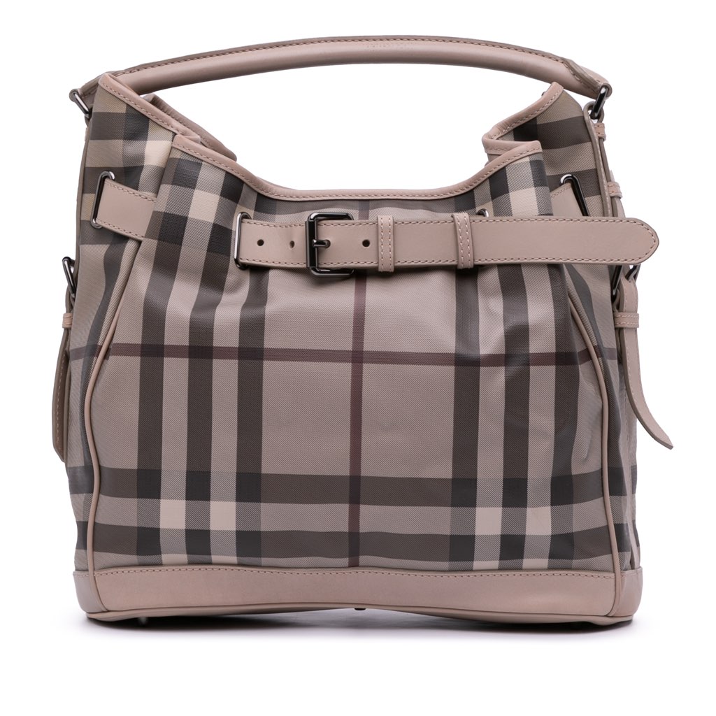 This shoulder bag features a coated canvas body with leather trim, a rolled leather strap, an open top, interior zip and slip compartments, and an interior zip pocket.