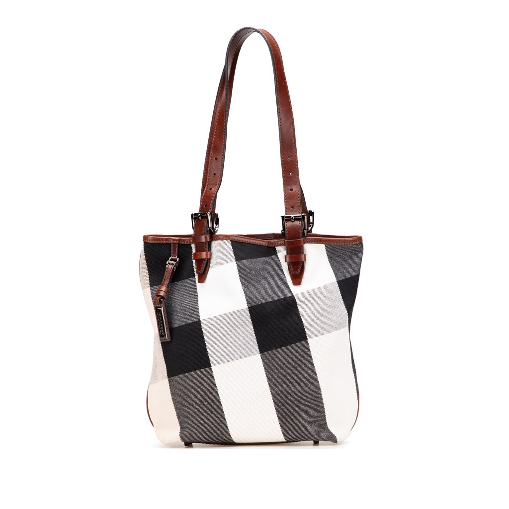 This tote features a plaid canvas body with leather trim, flat leather straps, an open top with a magnetic snap button closure, and interior zip and slip pockets.