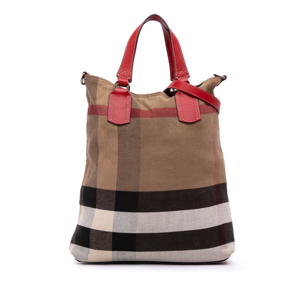 This satchel features a mega check canvas body, flat leather handles, a detachable flat leather strap, an open top with a snap button closure, an interior zip pocket, and a pouch inclusion.