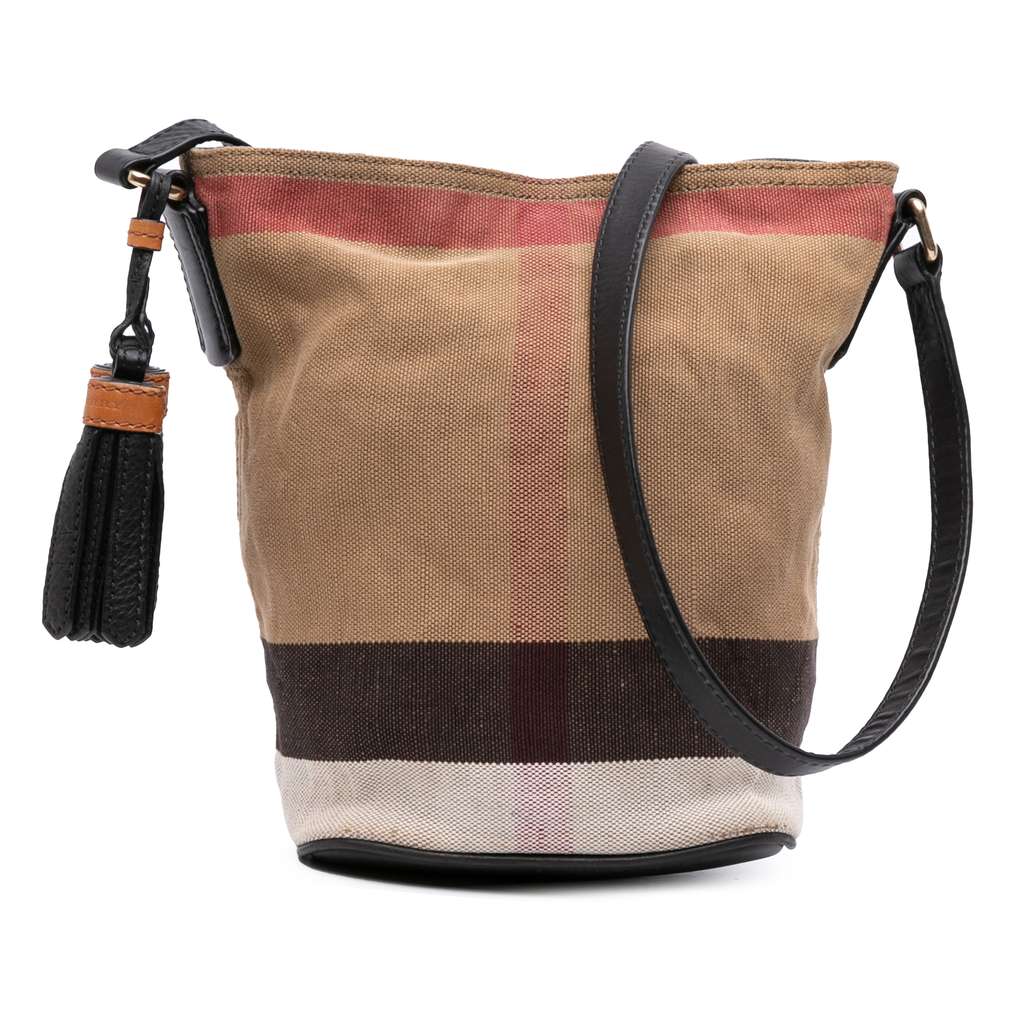 The Mini Ashby features a mega check canvas body with leather trim and tassel details, an adjustable flat leather shoulder strap, an open top with magnetic snap closure, and a pouch inclusion.