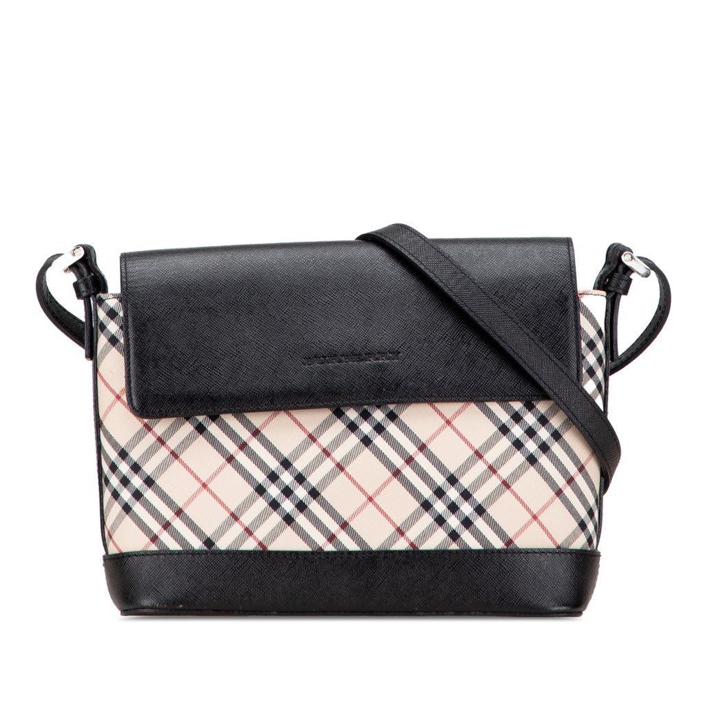 This crossbody bag features a canvas body with leather trim, a flat leather shoulder strap, a front flap with magnetic snap closure, and an interior zip pocket.