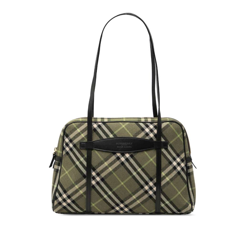 This shoulder bag features a nova check canvas body with leather trim, flat leather straps, a top zip closure, and interior slip pockets.