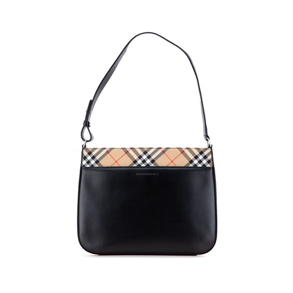This shoulder bag features a leather body with nova check canvas trim, a flat leather strap, an open top with magnetic snap closure, and an interior zip pocket.