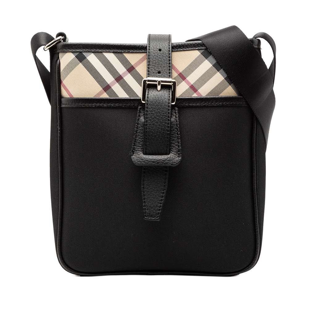 This crossbody bag features a nylon body with leather trim, an adjustable flat canvas strap, an open top with a flat strap and magnetic snap closure, exterior front and back slip pockets, and interior zip and slip pockets.