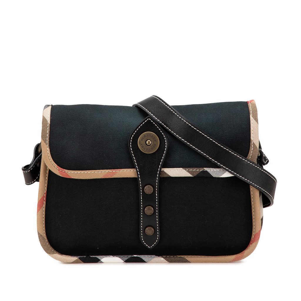 This crossbody bag features a canvas body, an adjustable flat leather strap, a front flap closure, an exterior back slip pocket, and an interior zip pocket