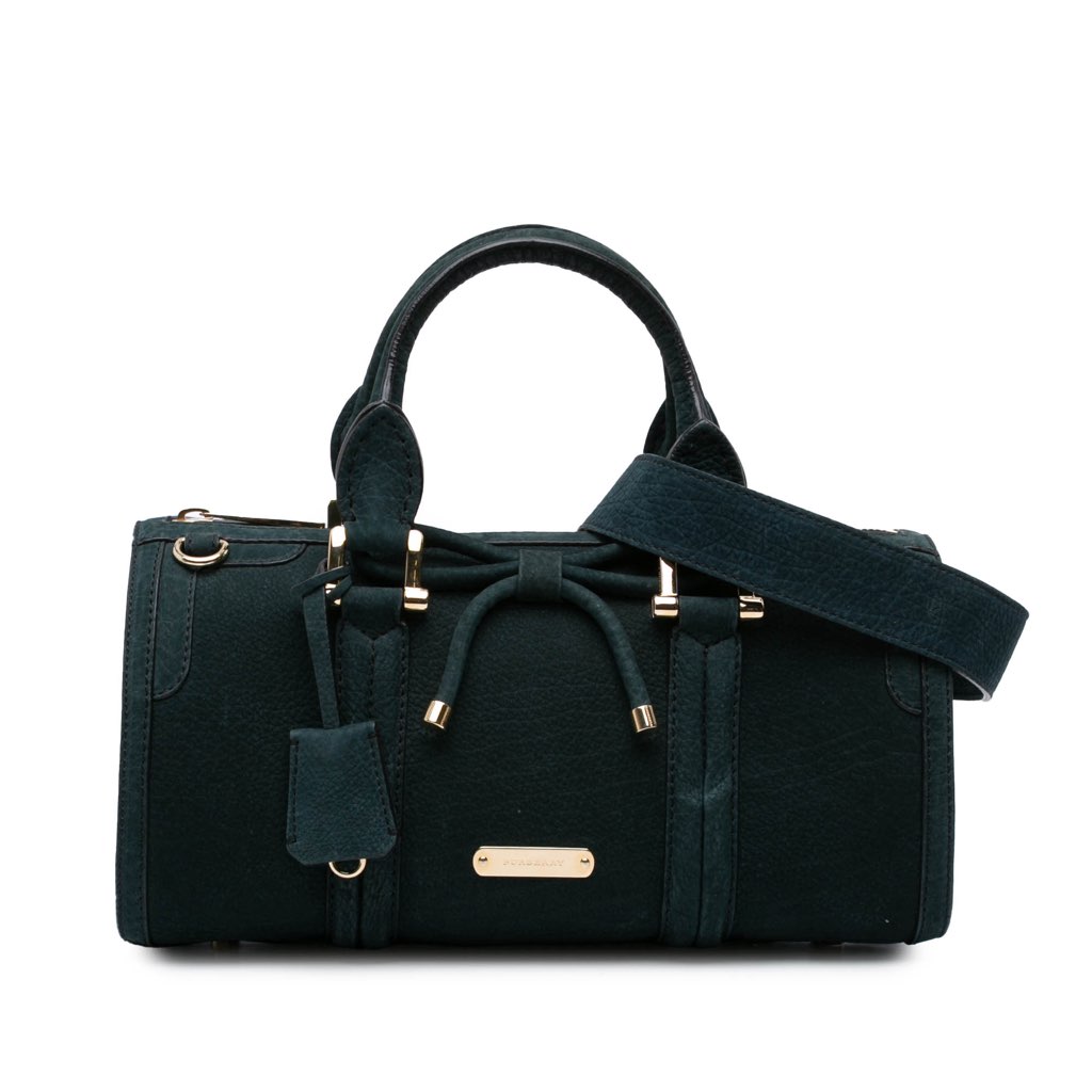 This satchel features a nubuck leather body with front bow detail, rolled handles, a detachable flat strap, a top zip closure, and interior zip and slip pockets.