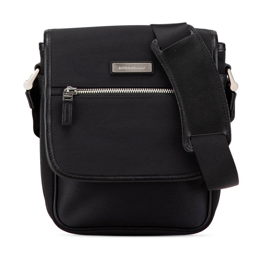 This crossbody bag features a nylon body with leather trim, an adjustable flat strap, a front flap with magnetic snap closure, an exterior zip pocket, and an interior zip pocket.