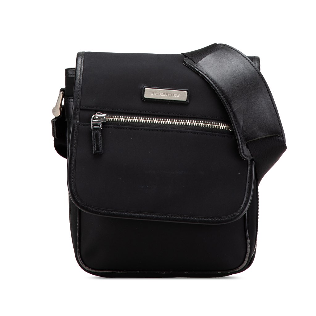 This crossbody bag features a nylon body with leather trim, an adjustable flat strap, a front flap with magnetic snap button closure, an exterior zip pocket, and an interior zip pocket.