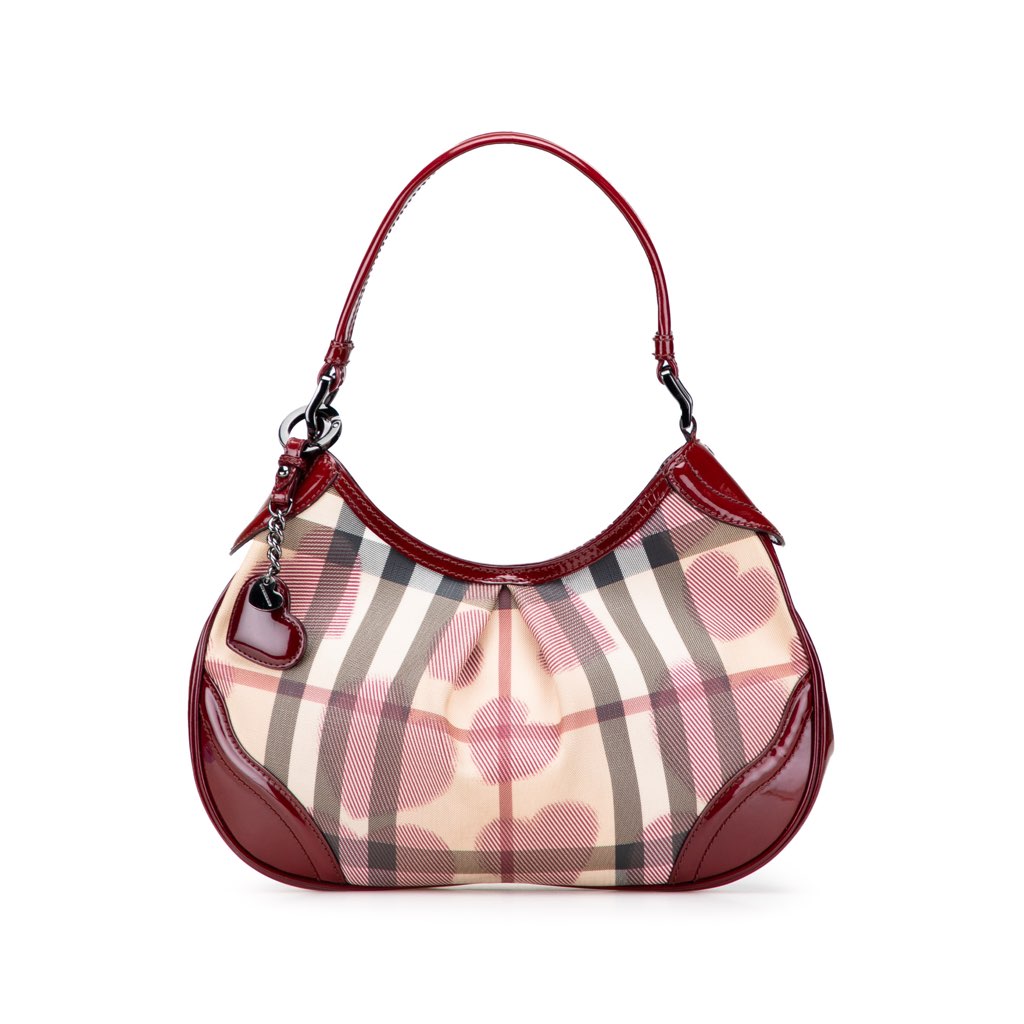 This shoulder bag features a printed plaid canvas body with patent leather trim, a flat leather strap, a top zip closure, and interior zip and slip pockets.