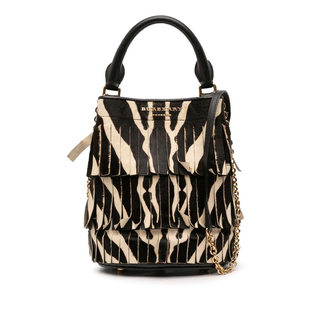 This bucket bag features a fringe pony hair body with leather trim, a rolled leather handles, a chain link strap with leather guard, and an open top with magnetic snap closure.